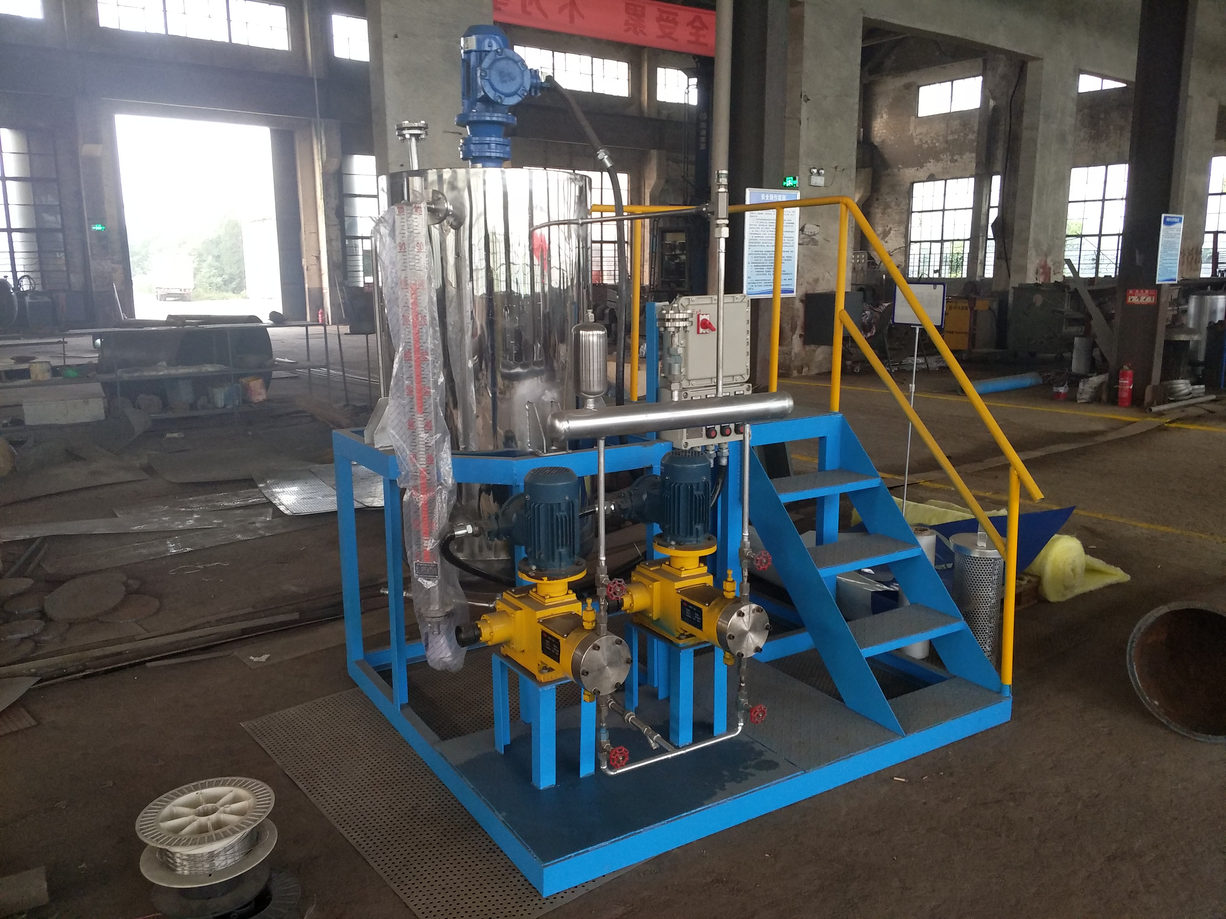 1、油田加药装置。主要用于在石油开采-向平台上的井口和及其他系统注入絮凝剂、阻垢剂、缓蚀剂、破乳剂等各种药液。