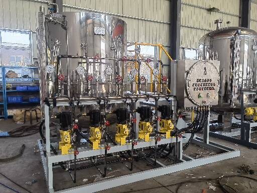 加药装置主要由溶液箱、搅拌器、计量泵、液位计、电控柜、管路、阀门、安全阀、背压阀、止回阀、脉动阻尼器、压力表、Y型过滤器等组成。 加药装置根据所需药剂浓度,在搅拌箱内配置,经搅拌器搅拌均匀后投入溶液箱、用计量泵向投药点或指定系统中输送所配制的溶液。成套加药装置具有结构紧凑、安全简单、操作遥遥简便等特点。加药装置还可根据用户不同工艺流程的要求,进行有针对遥遥的设计、配置遥遥要的部件,实现自动远程控制等功能。