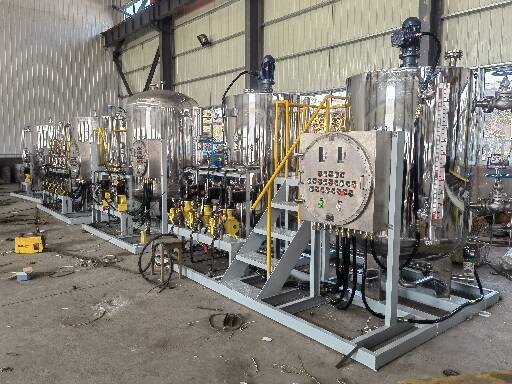 炉外成套化学加药装置(加氨,磷酸盐)是以计量泵为主要投加设备、将溶药箱、搅拌器、 液位计、安全阀、止回阀、压力表、过滤器、缓冲器、管路、阀门、底座、扶梯、自动监视系统、电力控制系统等按工艺流程需要组装在一个公共平台上,形成一个模块,即所谓的撬装式组合式单元(简称“撬体”)。按需要将定量的药剂放入搅拌溶液箱内进行搅拌溶解,溶解完毕后再通过计量泵送至投加点的工作过程,加药量的大小可自由任意调节,以满足不同(加药)量的场所。
