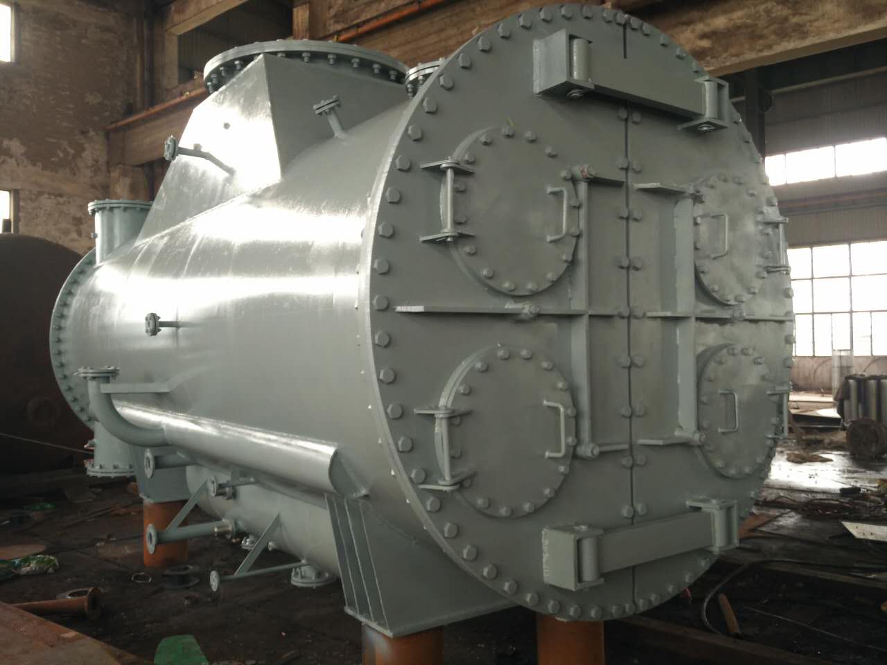 双背压凝汽器工作过程:凝汽器正工作时,冷却水由低压侧的两个进水室进入,经过凝汽器低压侧壳体内冷却水管,流入低压侧另外两个水室,经循环水连通管水平转向后进入压侧的