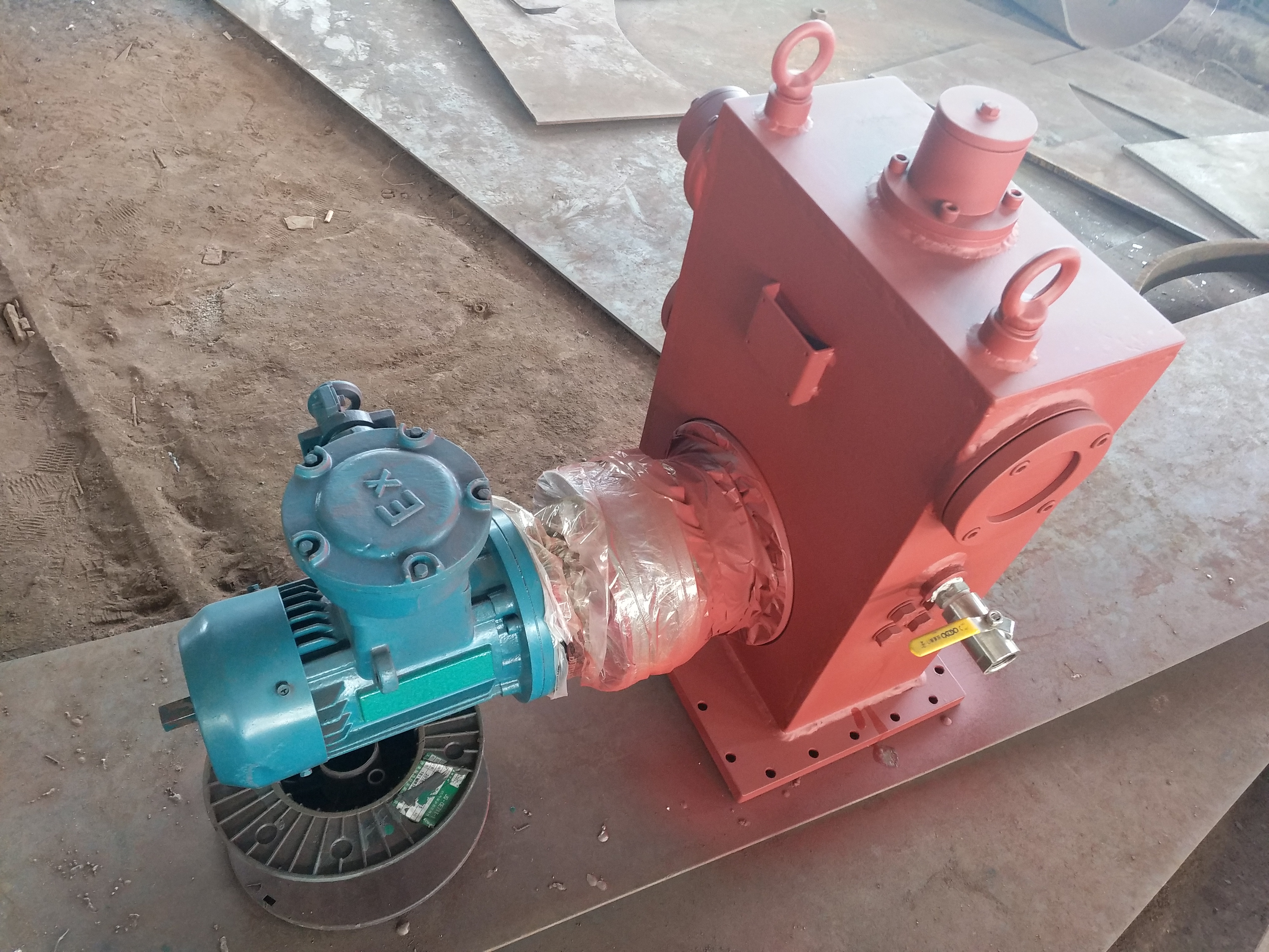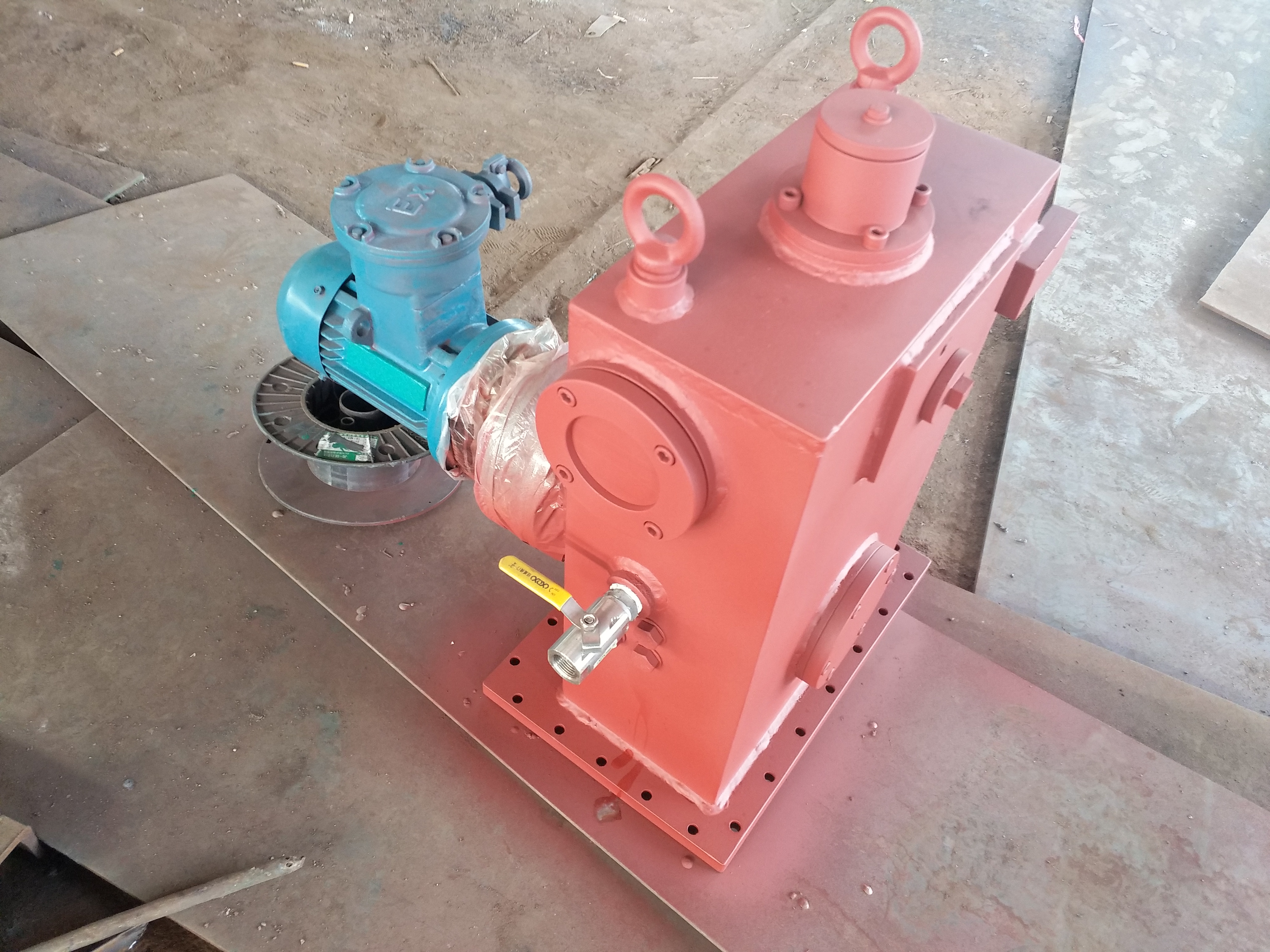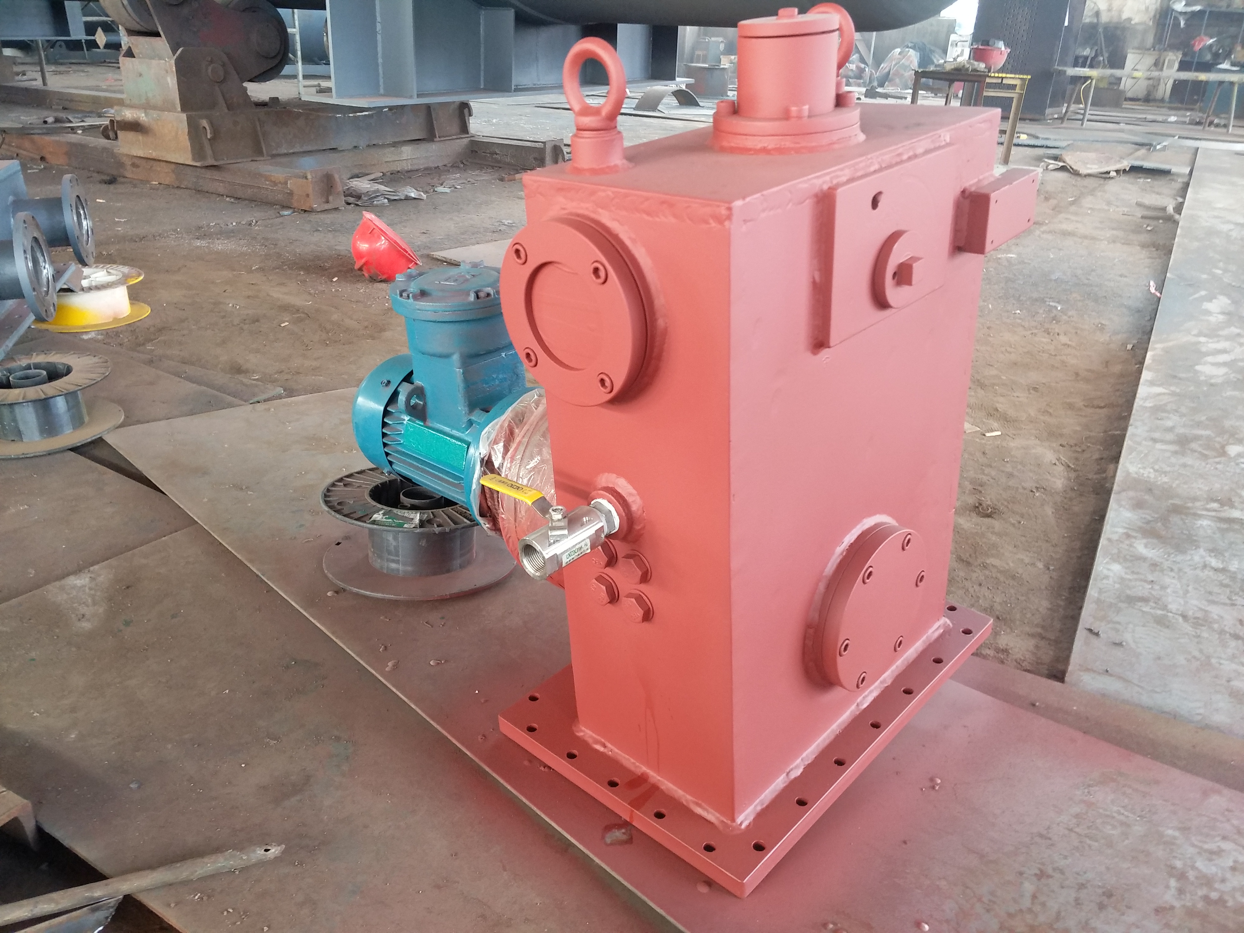 汽轮机主轴盘转装置,是针对汽轮机组-修-,主轴-须进行盘转的要求而设计、制造的动力装置。汽轮机组在-修过程-,要对主轴进行分解-修,而后进行--组合。组合时,主轴各--须都保了同心。组合-,对主轴各-同心度进行盘转-测,并进行-要的技术-处理,消除误差,从而使主轴各-同心度达到规定-度要求。主轴各-同心度的盘转-测是通过盘转装置完成的,汽轮机主轴盘转装置通过主轴上与启动盘车啮合的齿轮(简称主轴齿轮)利用机体上原有螺孔及螺栓将装置固定,在开动减速器后,即可将汽轮机主轴在拆-状态下进行缓慢的均匀旋转(每分种约-转)。
